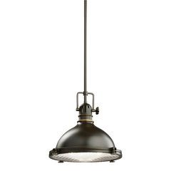 Kichler 1 Light Pendant | Olde Bronze 2665OZ (Olde Bronze) Classic industrial form in a pendant with a Fresnel lens is what you will find in this Olde Bronze fixture. 1 light, 100-W (M) max. Diameter 8", body height 10 1/2" and overall 48". **PLEASE note this product does not include shipping, please call 949-831-7600 for an accurate freight quote**...