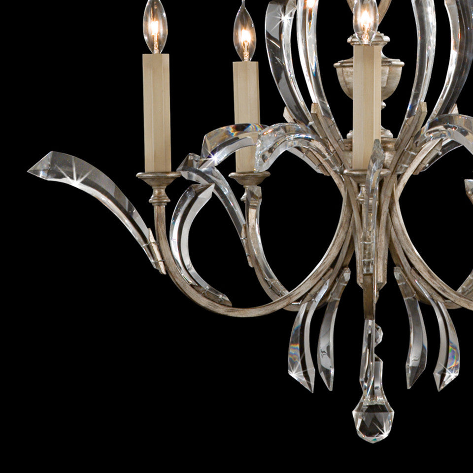 Hand crafted golden metalwork houses a sleek seeded LED Chandelier.