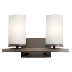 Kichler 45496OZ Crosby 2 Light Bath Bar Olde Bronze The Crosby 15" 2 light Vanity Light features a contemporary style with its clean lines and metal accents in Olde Bronze® finish and satin etched cased opal. The Crosby vanity light works in several aesthetic environments, including traditional and modern. Install Up or Down Width: 15.00 in. Height:8.75 in. Primary Bulb(s):...