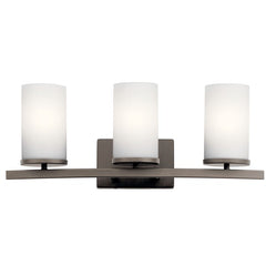 Kichler 45497OZ Crosby 3 Light Bath Bar Olde Bronze The Crosby 23" 3 light Vanity Light features a contemporary style with its clean lines and metal accents in Olde Bronze® finish and satin etched cased opal. The Crosby vanity light works in several aesthetic environments, including traditional and modern. Install Up or Down Width: 23.00 in. Height:8.75 in. Primary Bulb(s):...