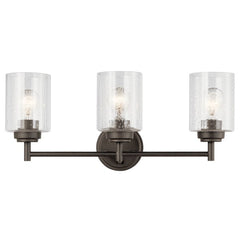 Kichler Winslow™ 45886OZ 3 Light Vanity Olde Bronze The modern Winslow 3-light 21.50" bath light in a Olde Bronze finish with Clear Seeded glass shade pair beautifully with the linear arms, bringing light and dimension to a space. Install Up or Down Width: 21.5 in. Height: 9.25 in. Primary Bulb(s): 3 x 75 watts Medium *PLEASE note this product...