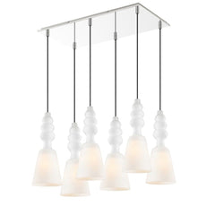 Chrome & Cased Opal Glass Shades Canopy 12”x 20”, Shade 5.5”Diameter x 14.25”H Black Cord Hung Adjustable Max Height 118.50” 6 Light Medium Base **PLEASE note this product does not include shipping, please call 949-831-7600 for an accurate freight quote** Open Box