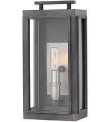 Hinkley Sutcliffe #2910DZ Square Wall Lantern The Sutcliffe collection conveys chic elements of early Americana styling. The candelabra lamping, clear glass and Antique Nickel reflector infuse this sleek pocket lantern design constructed of solid aluminum with a perfect blend of old and new. Finish: Aged Zinc with Antique Nickel accents Width: 7.00" Height: 14.00" Glass: Clear Material: Solid Aluminum **PLEASE...